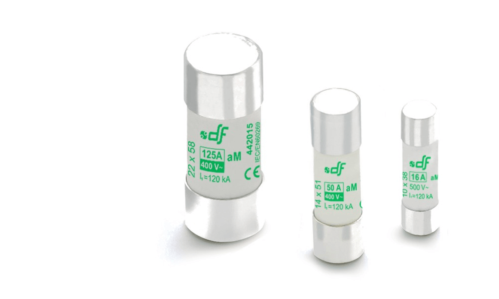 aM Class Cylindrical fuse links are intended for short circuit protection in motors, transformer and other load with high inrush currents. Excellent protection of switchgear (contactor, thermal switch) due to the good current limiting capability and low I2t values. These fuse links must be associated to an overload device protection as a thermal switch. Made of ceramic tube with high withstand to internal pressure and thermal shock, that allow a high breaking capacity in a reduced physical space. The melting elements are silver plated in order to avoid the aging and thus keep unalterable the electric characteristics. Contacts caps are made of silver plated copper. Available versions with fusing indicator or with striker for use in fuse holders with microswitch.