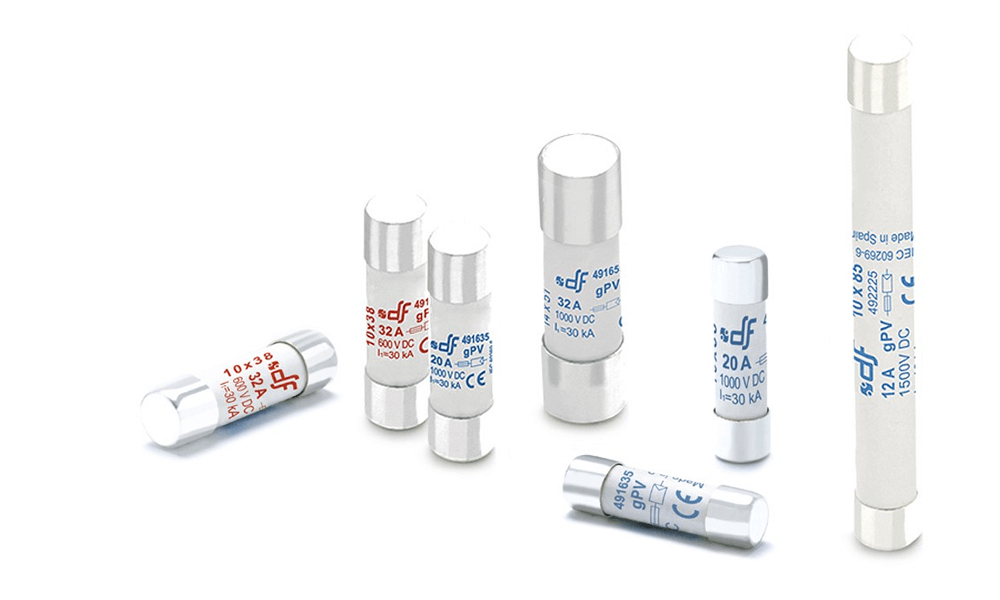 PV fuse-links for photovoltaic installations from DF Electric have been developed to offer a compact, safety and economic protection solution in photovoltaic installations where, due to the increase of the power and technologic evtion, no-load voltages above 800V DC are reached. Also meet the requirements for instruments (multimeters) and tarction equipment auxiliary circuits. The range comprises 10×38 & 14×51 fuse-links with rated currents between 1A and 20A. Rated voltage is 600 V DC or 1000V DC (direct current). Provide protection against overloads as well as short-circuits. Made with ceramic tube with high withstand to internal pressure and thermal shock, that allows a high breaking capacity in a reduced physical space. Contacts are made of silver plated copper and melting elements are made of pure silver in order to avoid the aging and thus keep unalterable the electric characteristics. For these fuse-links we recommend the utilization of PMX 1000V fuse holders in single pole version or two-pole version.